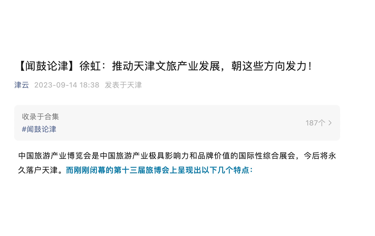 “津云”公众号刊发我院徐虹院长关于天津文旅产业发展方向文章