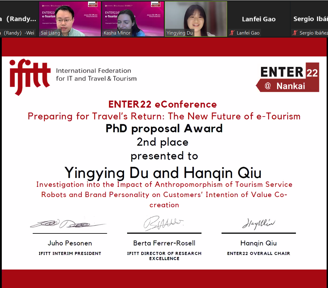 查看详情(通讯员 李正莉 陈美里 张俊娇)2022年1月11日至14日,以“为旅游的回归做好准备:电子旅游的新未来”为主题的2022年电子信息与旅游国际会议(ENTER22@Nankai: e-Tourism Conference)成功举办。此次会议由南开大学主办、yl23455永利官网承办、国际电子信息和旅游联合会(IFITT)协办,采用“Zoom会议+直播”的方式进行,1月11日为博士研究生工作坊,1月12-14日为ENTER22主会议。此次会议共吸引120位来自世界各地的旅游...