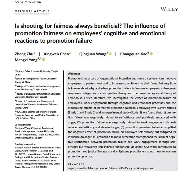 查看详情近日,我院王庆娟副教授作为通讯作者,与合作者完成的研究成果《Is shooting for fairness always beneficial? The influence of promotion fairness on employees’ cognitive and emotional reactions to promotion failure》被人力资源管理领域国际顶级期刊《Human Resource Management》接受并发表,该期刊是FT50重要期刊。晋升是人力资源管理实践的重要环节,是员工实现职业生涯发展以及获取薪水增长等的重要手段。在晋升...