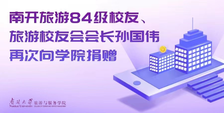 查看详情2022年11月16日,南开旅游84级校友、旅游校友会会长孙国伟向南开旅游发展基金再次捐赠人民币10万元。孙国伟校友一直心系学院建设,自2019年以来,已连续四年向学院捐赠共计40万元,在校友会工作方面也始终致力于服务校友、反哺母校,着眼于为校友和学院搭建沟通合作的桥梁、对接校企资源,促进旅游专业知识教育、人才培养与行业实践相结合,不断为学院发展建言献策、提供捐赠资金支持。本次学院获得的校友捐赠基金将根据捐赠人...