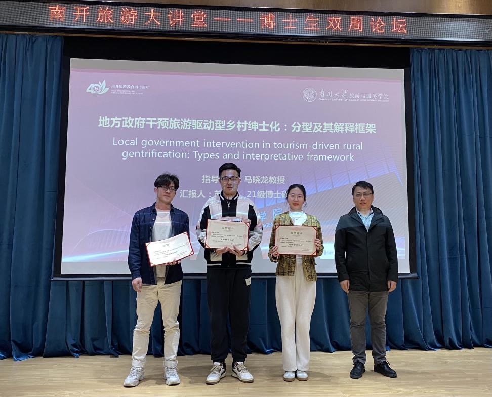 3月10日下午,2022-2023年度第一学期博士生双周论坛“高质量体验演讲”荣誉授予仪式在yl23455永利官网111多功能厅顺利举行。yl23455永利官网副院长李辉教授为王国权、吴建垲、高澜菲三位获奖的博士生颁发荣誉证书,并与同学们合影留念。副院长李辉教授在颁奖仪式上向三位获奖博士生表示肯定与鼓励,激励同学们努力将优秀培养成一种习惯,并对“旅游大讲堂——博士生论坛”的未来发展表达了坚定的信心和期待。