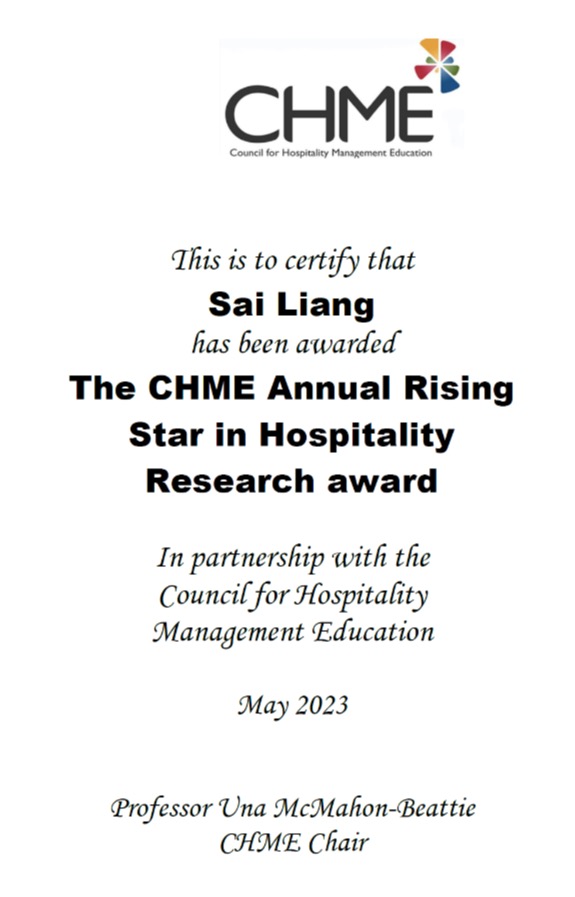 查看详情近日,2023国际酒店管理与教育委员会(Council for Hospitality Management Education,CHME)年度会议在荷兰举办,会议上授予了我院梁赛副教授 “the CHME Annual Rising Star in Hospitality Research award”(年度研究新星奖),以表彰其在酒店管理研究方面的创新和卓越贡献。这是我院教师首次获得此类奖项。该奖项主要颁发给在酒店管理(包括教育)领域博士学位完成8年内,其研究成果对酒店和接待业管理领域产生了积极社...