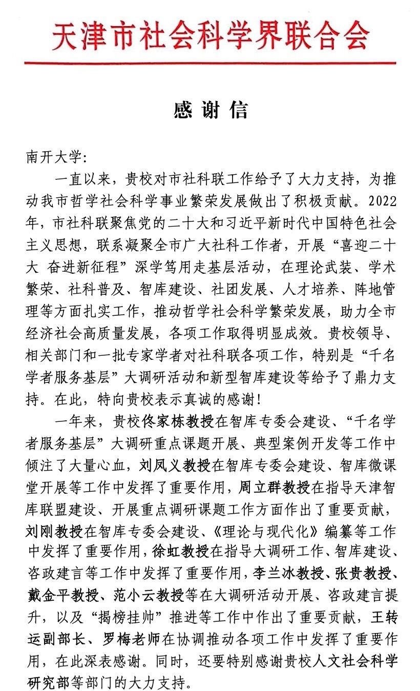 天津市社会科学界联合会来信,感谢我校对天津市社科联各项工作,特别是“千名学者服务基层”大调研活动和新型智库建设等给予的鼎力支持。其中,我院院长徐虹教授在指导大调研工作、智库建设、资政建言等工作中发挥了重要作用,天津市社科联对此深表感谢。
