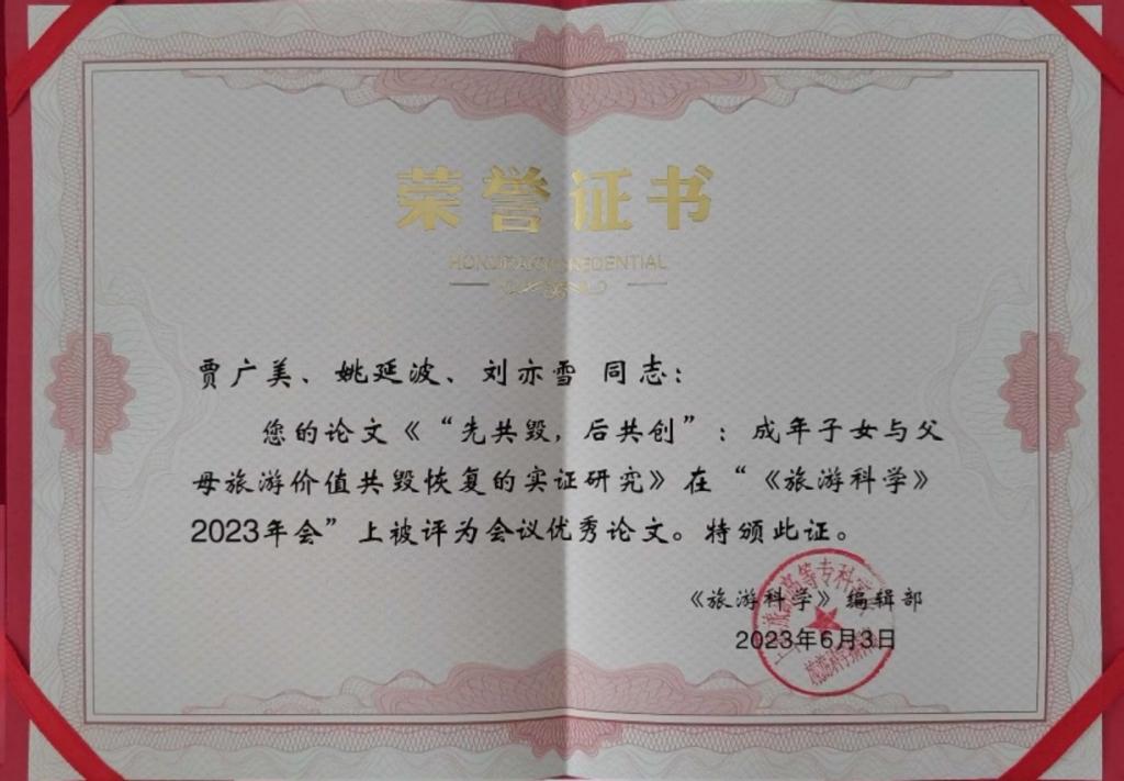 查看详情由上海师范大学、上海旅游高等专科学校主办,上海师范大学yl23455永利官网、《旅游科学》编辑部承办的“《旅游科学》2023年会”于2023年6月1-4日在上海召开,此次会议汇聚了国内外文化和旅游研究领域的专家学者,分享研究成果,交流研究经验,共同推动中国式现代化与文旅高质量发展研究的不断深入。我院姚延波教授团队的文章“‘先共毁,后共创’:成年子女与父母旅游价值共毁恢复的实证研究”获评“2023《旅游科学》年会”优秀会议论...