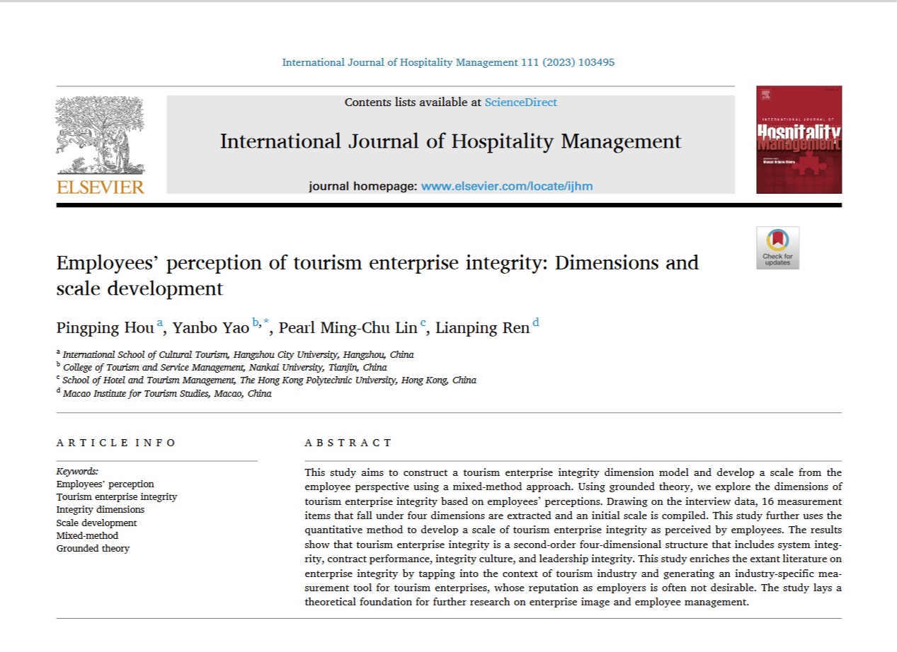查看详情近日,姚延波教授作为通讯作者与合作者完成的研究成果《Employees’ perception of tourism enterprise integrity: Dimensions and scale development》在国际高水平期刊《International Journal of Hospitality Management》上发表。该期刊2022年影响因子为10.427,在旅游管理领域中具有权威性、学术影响力和学术声誉。该文章以利益相关者理论为基础,采用定性与定量研究相结合的方法,从员工感知的视角出发,构建了旅游企业...