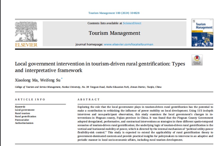 近日,由我院马晓龙教授与博士研究生苏伟锋共同完成的研究成果《Local government intervention in tourism-driven rural gentrification: Types and interpretative framework》被旅游管理学科顶级期刊《Tourism Management》接收并发表。该论文通过将中国独特的乡村旅游发展经验纳入到国家主导型绅士化的理论框架下,对起源于欧美国家,以市场为主导的乡村绅士化理论进行修正和完善,提出“政治效用-权力弹性-风险控制”为传...