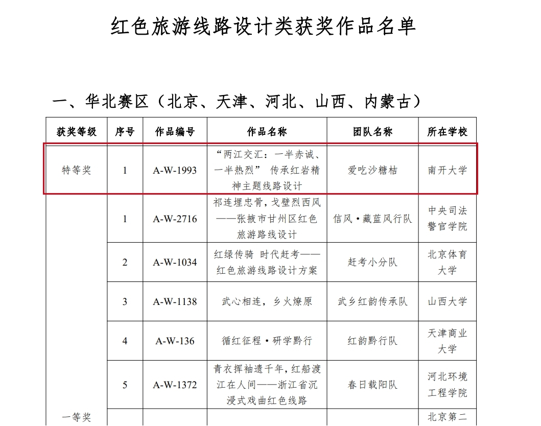 查看详情(通讯员 李诗韩)近日,由文化和旅游部资源开发司、国家发展改革委社会发展司、共青团中央宣传部等单位主办的第十四届全国大学生红色旅游创意策划大赛初赛结果公布。我院石培华教授指导的团队——李诗韩、黄杏灵、谭家捷、程云的作品“‘两江交汇:一半赤诚、一半热烈’传承红岩精神主题线路设计”喜获华北赛区红色旅游线路设计赛道特等奖并入围全国决赛(全国共十支团队入围),杨德进副教授指导的团队——李若莹、刘梦涵、徐...