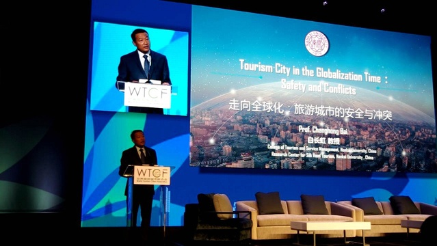 9月21日,院长白长虹教授受邀出席世界旅游城市联合会(WTCF)2017洛杉矶香山峰会,在首场论坛上作“走向全球化:旅游城市的安全与冲突”的主旨演讲。