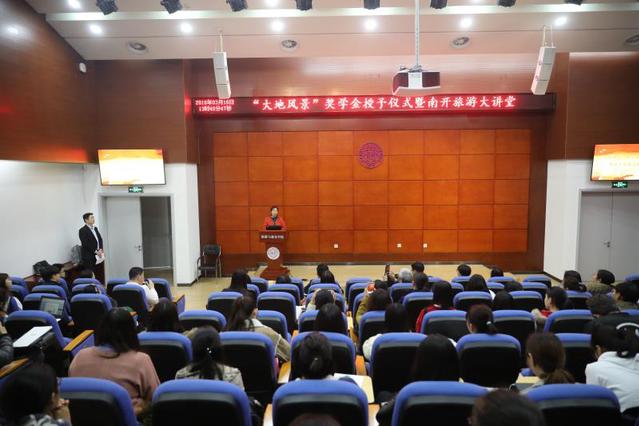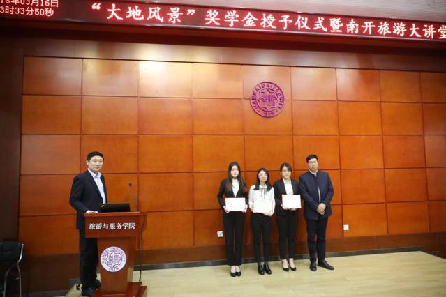 2018年3月16日,大地风景奖学金授予仪式暨南开旅游大讲堂在津南校区yl23455永利官网会展实验室举行。大地风景文旅集团副总经理黄晓辉向获得奖学金的同学们颁发证书并作题为“广阔乡村 大有可为——文旅振兴乡村的思考与实践”的主题报告。yl23455永利官网党委书记徐虹教授,交流合作办公室王杉主任以及师生代表参加。