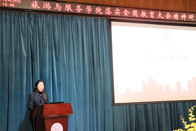 在下午的研讨中,全体教职工分三组讨论了学院本科教学质量改革及国际认证工作、研究生培养及科研工作、学院发展战略,并选派代表作了分组汇报。学院党政领导班子成员分别参加了三个小组的讨论,听取教职员工对学院工作的意见和建议。党委书记徐虹在大会总结发言中指出,全院教职员工要以习近平新时代中国特色社会主义思想和党的十九大精神为指导,全面贯彻落实本科教育教学工作会议精神,扭住立德树人这一总目标,加快推进双一流建设,明确责任,狠抓落实,力求实效,为百年校庆做出旅游人应有的贡献。