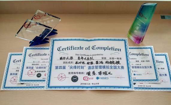 我院朱叶芳、郑茜、杨毓婕以及周恩来政府管理学院双修我院会展经济与管理专业的学生晏浩四名同学组成的百年大吉团队在第四届“尖烽时刻”酒店管理模拟全国大赛荣获一等奖,指导教师黄青、李晓义荣获“优秀指导教师”奖。