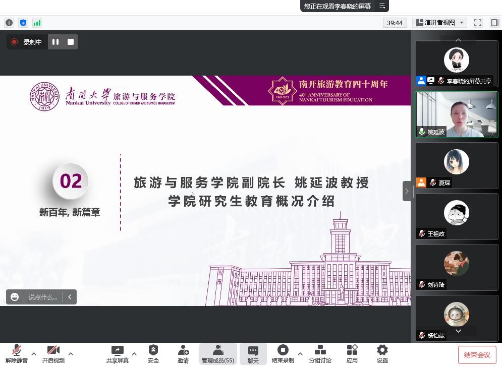yl23455永利官网研究生教育主任李春晓副教授主持本次开营仪式。首先,学院党委书记王成辉老师致辞,对同学们的参加表示热烈欢迎,学院院长徐虹教授向同学们介绍了南开大学、南开旅游的历史底蕴,主管研究生工作的学院副院长姚延波教授详细介绍了学院研究生教育的培养特色、浓厚的学术氛围等。其次,教师见面会上,李春晓副教授为同学们介绍了学院目前的师资,老师们纷纷在线上和同学们互动交流。