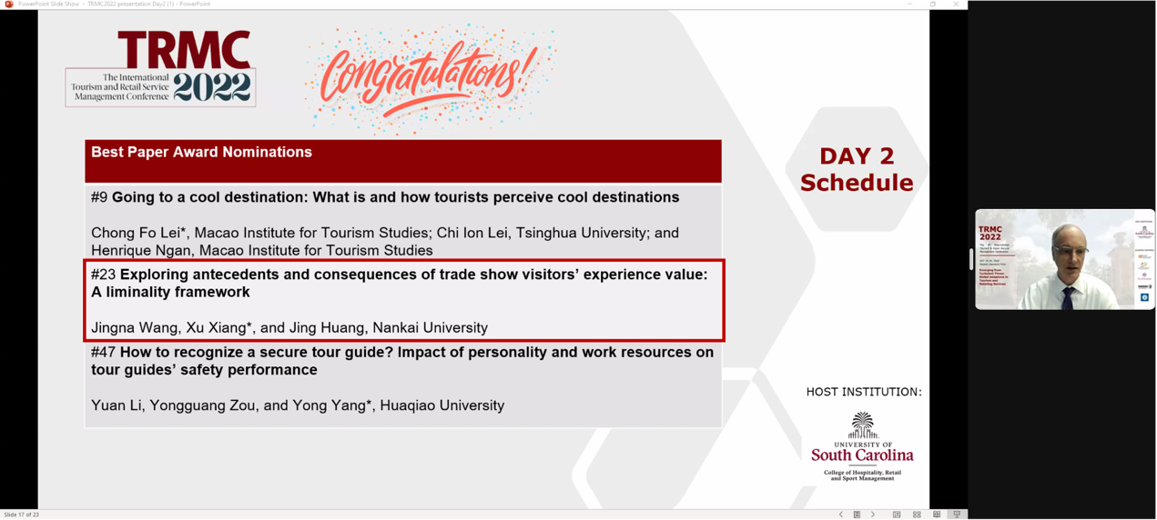 北京时间20日晚,TRMC2022圆满闭幕。闭幕式上首先公布了6篇最佳论文提名奖,经论文评审委员会严格评审和投票,从中选出了3篇最佳论文。我院王菁娜副教授团队的研究论文“Exploring antecedents and consequences of trade show visitors’ experience value: A liminality framework”获得最佳论文提名奖。最后,组委会宣布了下一届TRMC会议的举办地,TRMC2023将回到中国澳门,由澳门yl23455永利官网承办。