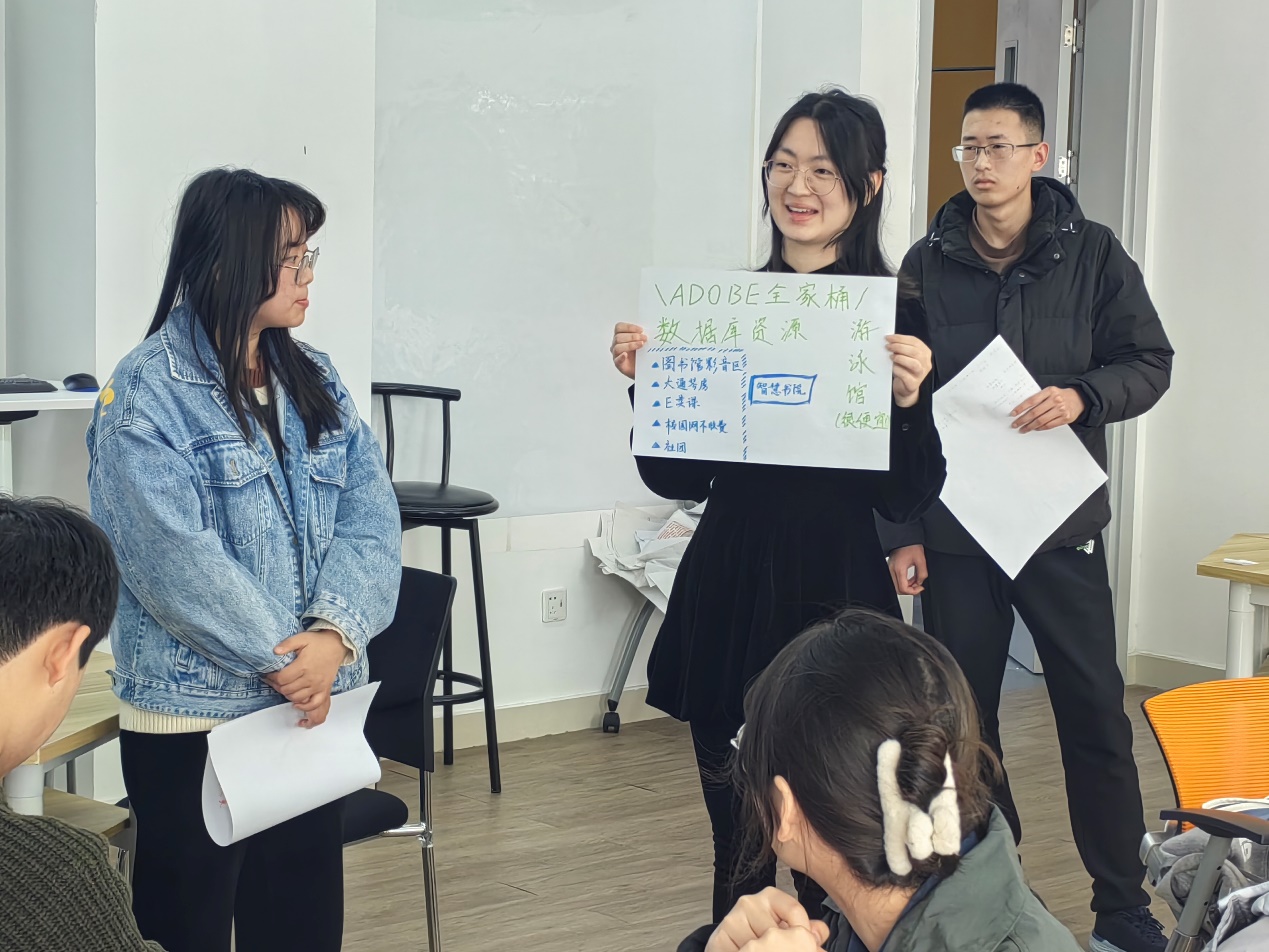 活动现场,来自不同年级、不同学院的学生们首先按照落座位置组成小组,进行小组内部讨论,并依次展示了各组的讨论结果,同学们聚焦于通识选修课、文惠卡、校友资源、学术工具软件版权资源等日常学习生活触手可及的资源进行了分享。