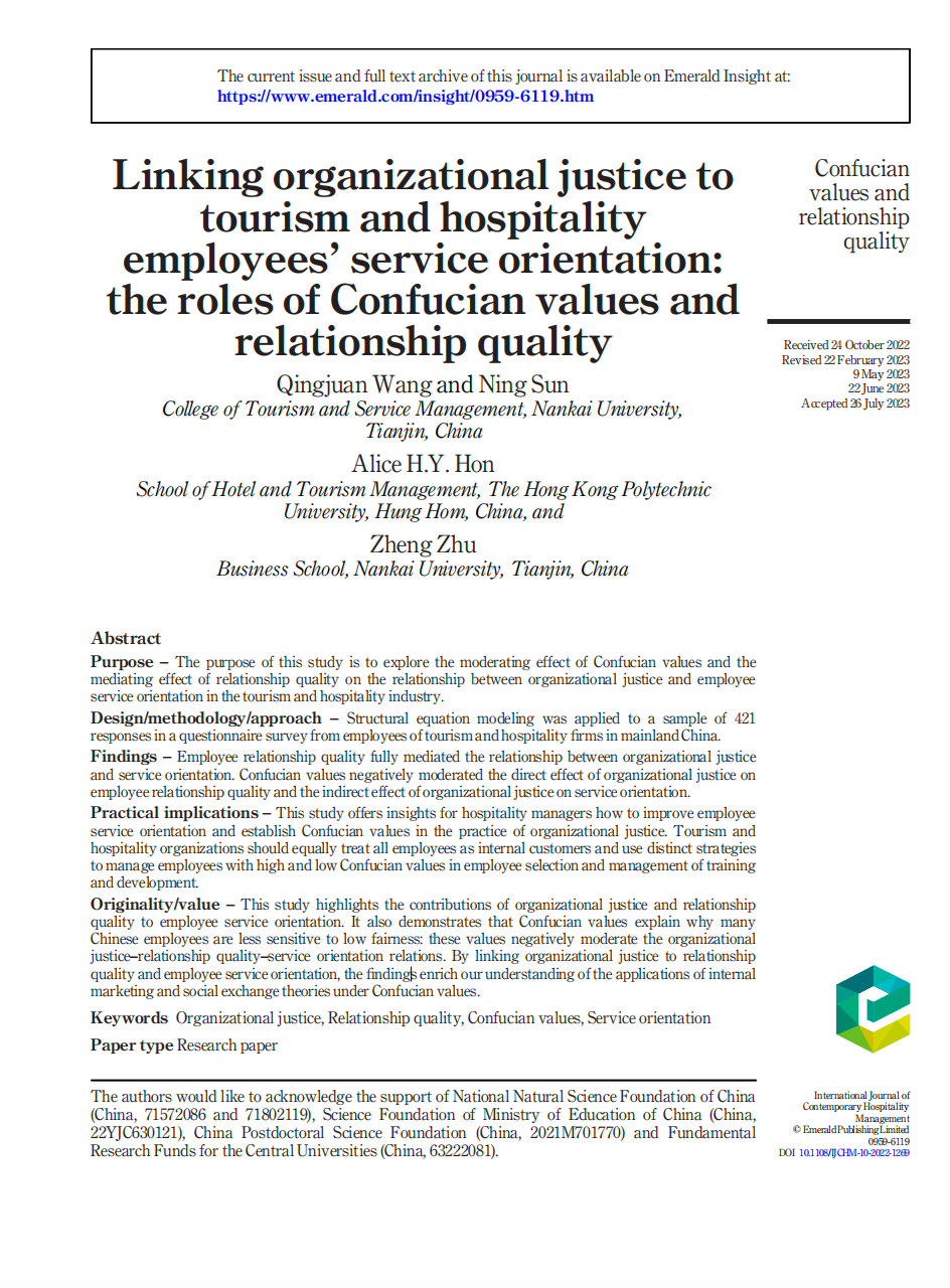 (通讯员 黄筱璐)近日,由我院王庆娟副教授、孙宁助理研究员及合作者共同完成的研究成果《Linking organizational justice to tourism and hospitality employees’ service orientation: the roles of Confucian values and relationship quality》被旅游管理科学国际五大顶尖期刊之一的《International Journal of Contemporary Hospitality Management》接受并发表。