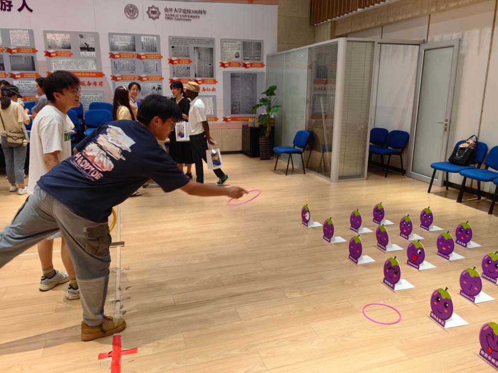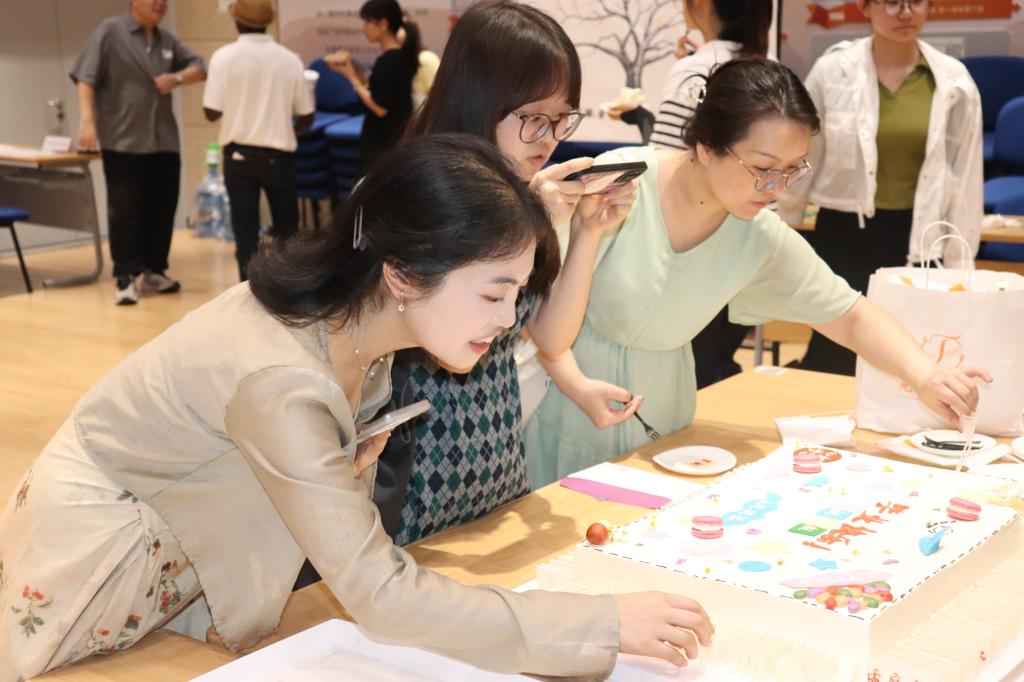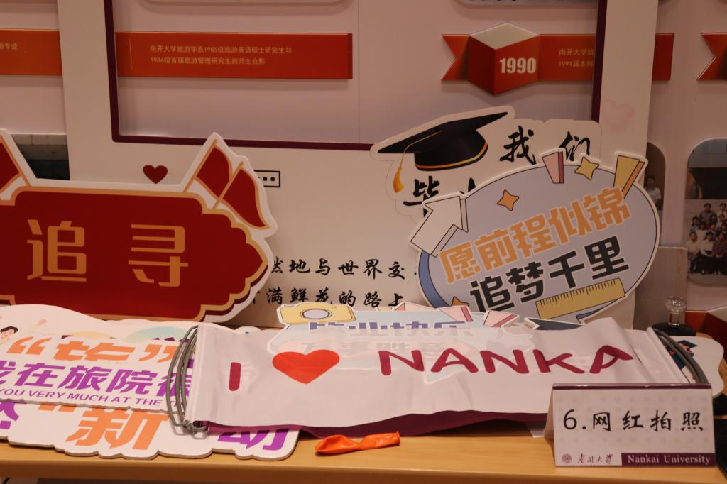 伴着毕业歌声响起,毕业嘉年华活动正式启动。活动现场,带有旅院记忆的毕业树主题装扮、多彩气球等手工制作的毕业装饰,充满青春气息,营造了浓厚的毕业季氛围。同学们纷纷在入口处领取“通关手册”——一套由旅院学生“南开光影”主题摄影展作品制作而成的集章明信片,随后在七个活动摊位前排起长队,等待打卡、集章。“毕业寄语”和“好物漂流”,让新老南开人完成“爱”的传递;“知识套圈”“旅院印记”,让毕业生们在欢笑中重温南开旅游的学习时光;“默契大考验”“爱的抱抱”等游戏项目,让毕业生们在欢乐竞技中感受同窗情谊。在特别设计的拍照板前,同学们拿起手持牌合影,留下青春最美的模样。场地中央,带着毕业生姓名的专属蛋糕是当天最“甜蜜”的环节,也吸引了一大波儿同学拍照。“真的太惊喜了!学院的用心让我们太爱了!”来自日本的留学生星美桂在参加活动时忍不住赞叹。