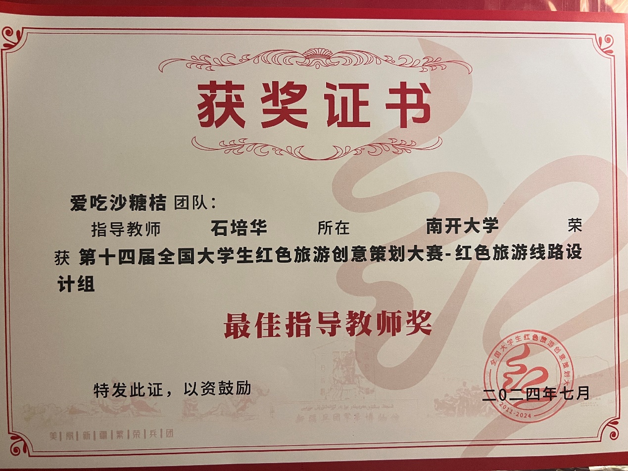 我院石培华教授指导的学生团队——“爱吃沙糖桔”(李诗韩、黄杏灵、谭家捷、程云)喜获第十四届全国大学生红色旅游创意策划大赛-红色旅游线路设计组一等奖;石培华教授获最佳指导教师奖。“爱吃沙糖桔”团队本次大赛参赛作品分为作品1——“两江交汇:一半赤诚、一半热烈”传承红岩精神主题线路设计和作品2——“年轻的城,盛放的石榴花”:新疆亲子研学主题线路设计,决赛共分为作品1视频展示、作品2现场展示和评委提问及答辩环节。