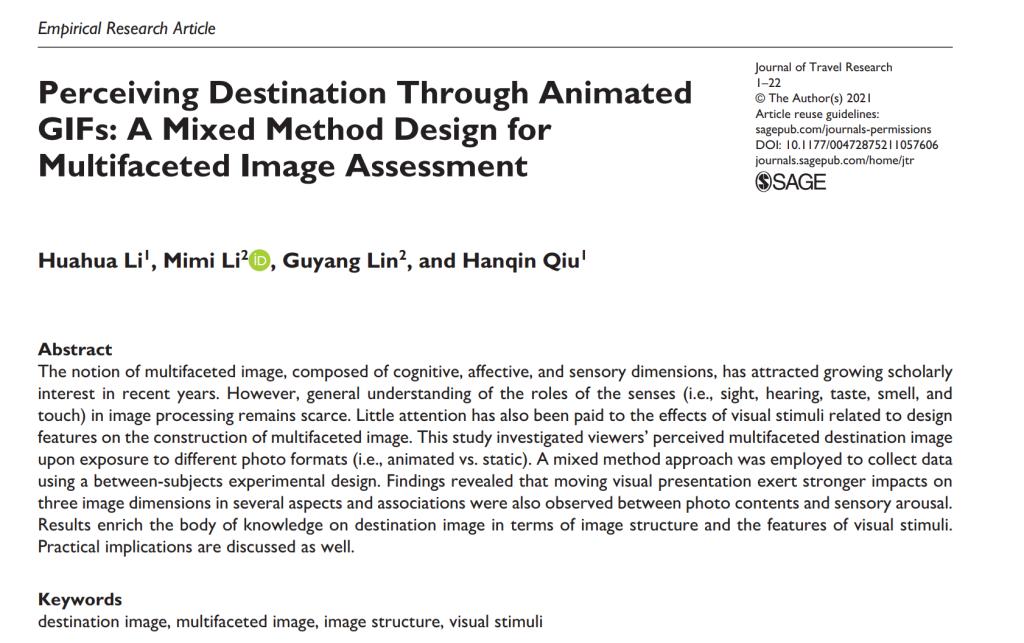 近日,由我院博士研究生李婳婳、邱汉琴教授与香港理工大学合作者共同完成的研究成果《Perceiving destination through animated gifs: a mixed method design for multifaceted image assessment》被旅游学科顶级期刊《Journal of Travel Research》接受并发表。