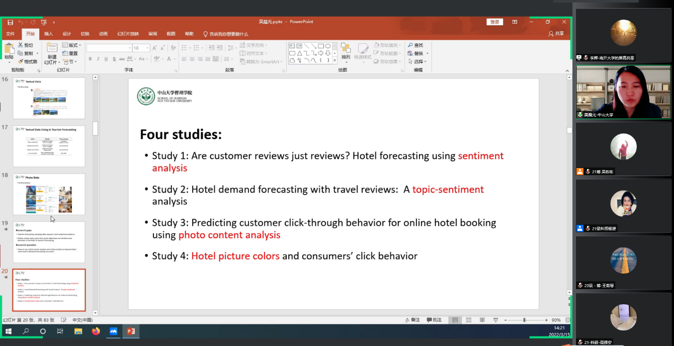 (通讯员:吴栋栋)3月15日下午,南开大学“旅游大讲堂——杰出教授论坛”在腾讯会议平台顺利开展。应我院邀请,中山大学管理学院吴晨光教授为我院师生带来了“基于文本与图片挖掘的旅游大数据预测与决策”的精彩线上讲座。我院青年教师、博士后和硕博研究生等校内外成员共计100余人参加了此次讲座,yl23455永利官网副院长李辉教授担任此次讲座的主持人。